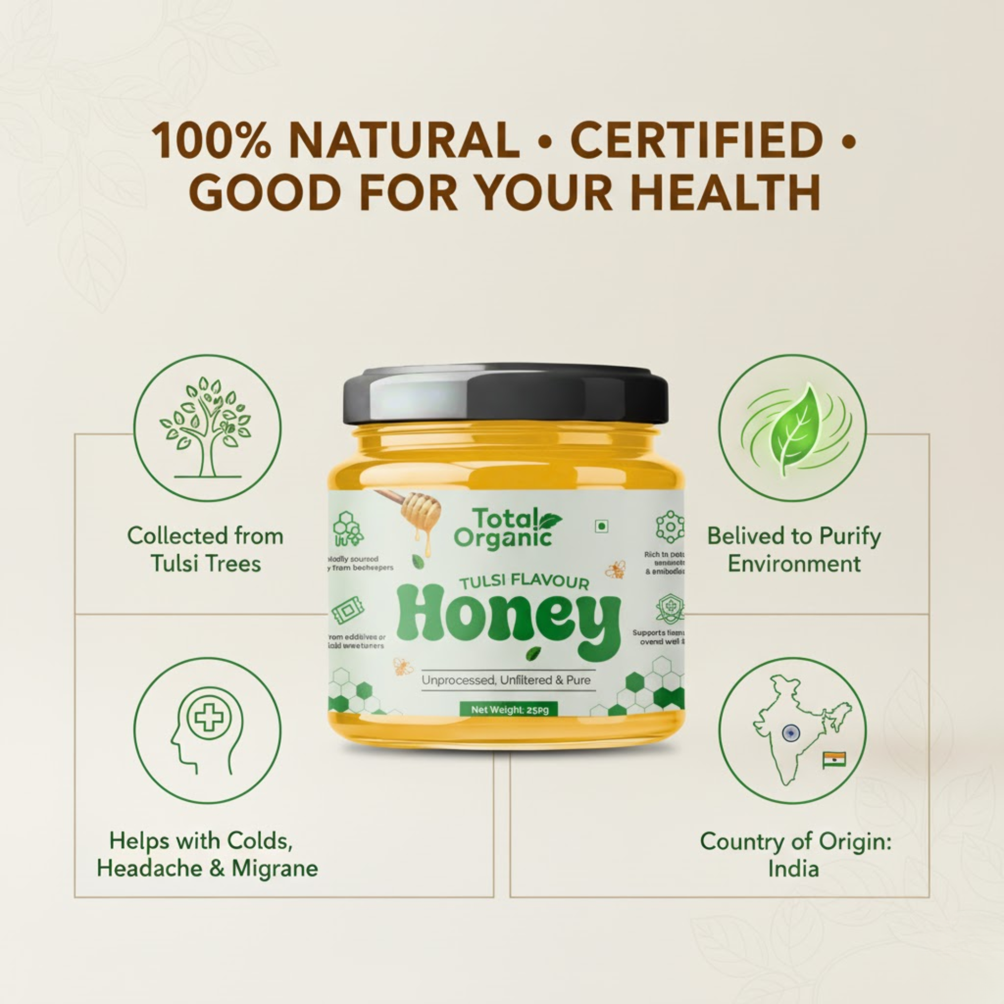 Experience the golden purity of Total Organic Honey, harvested from nature’s finest hives. Each drop is raw, unprocessed, and packed with natural antioxidants, enzymes, and minerals. Free from additives and refined sugars, it nourishes your body, boosts immunity, and adds a touch of natural sweetness to everyday life. With Total Organic, enjoy the true taste of nature — pure, honest, and full of wellness in every spoonful.
